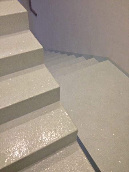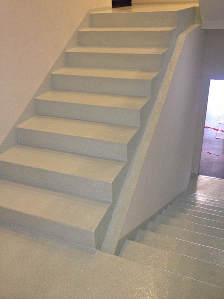 Execução de revestimento continuo saturado com palheta em degraus e patamares de escada interior.